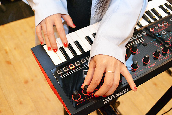 今回Sachikoに試奏してもらった「JD-Xi」は、前述のとおりアナログとデジタル両方の音源を搭載する“クロスオーバー・シンセサイザー”だ。デジタル・シンセには、多くのプロから高評価を受けているJUPITER-80やINTEGRA-7と同等のSuperNATURALシンセ・エンジンが採用されていて、リアルで鋭いPCMサウンドやアナログ・モデリングのサウンドを鳴らすことができる。これだけでも十分多彩な音が出せるのだが、「JD-Xi」にはさらに新開発のアナログ回路のシンセも搭載されている。ここではサブ・オシレーターやアナログ・タイプのローパス・フィルターも使えるので、図太いシンセ・ベースなど、アナログならではのサウンドも楽しめる。