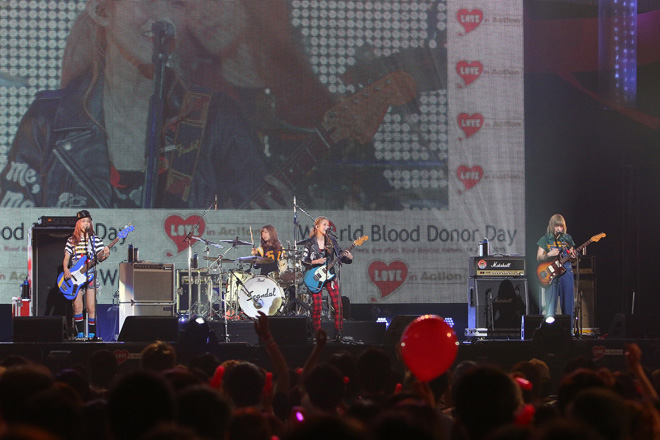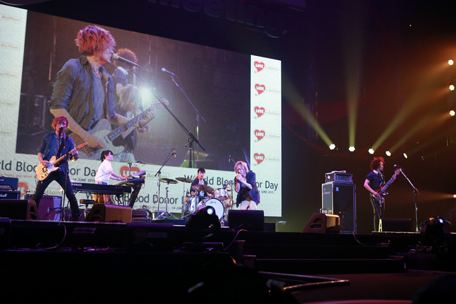 イベントのトップを飾ったのはAqua Timezだ。ボーカルの太志が「明日なくなってしまうかもしれない命を助けられるなら、この命使ってください!最高!」と呼びかけ、「シンガロング」や「虹」など4曲を披露した。「僕の父親も献血をしたことがあり、今では父のことをとてもかっこいいと思うようになりました。献血をすることは誰かが褒めてくれるわけじゃないけど、本当にすばらしいことだと思います!みんな献血に行こう!」と献血の大事さを集まった観客に向けて訴えた。