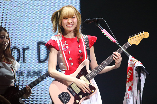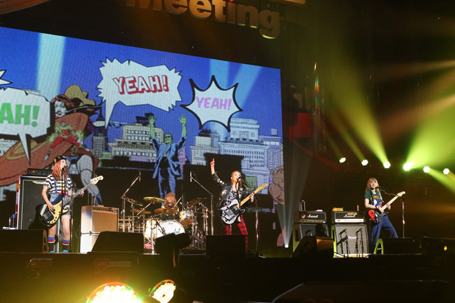 次に登場したSCANDALは、大きな歓声が沸き起こる中で披露した「夜明けの流星群」で大合唱と手拍子を巻き起こし、会場がひとつになってうねりを見せる。曲の間のトークセッションでHARUNAは「この<LOVE in Action Meeting(LIVE)>に初めて出られてとても嬉しいです。今日歌った中で、このイベントと同じタイトルの「love in action」という曲があります。私たちが伝えたいことは、全部曲の中に入れました!」と笑顔で語り、会場は更に一体感を増した。
