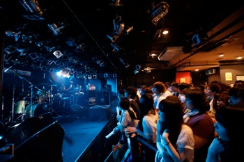 マイクスタンドを中心に、その背後にドラムセット。下手にベースとギター、上手にキーボードとギターと両翼が広がるステージ上は機材が配置されたのみで、至ってシンプル。開場からわずか数分後に埋め尽くされたフロアの熱気があまりにも凄まじく息苦しいほど。室内音が開場前より数度上昇していることが肌で感じ取れる。水蒸気が白いケムリとなって立ち上る開演前の場内は、期待に膨らむライブハウスならではの光景だ。