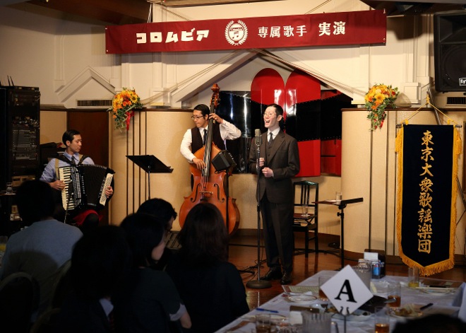 そしてアルバムのリリースに先がけて本日6月15日(月)、彼らは東京・銀座の音楽ビヤプラザ・ライオンにてデビューお披露目演奏会を開催した。マスコミ関係者ら100人が詰めかける中、紹介VTR&プロモーションビデオ放映後に3人が登場して演奏会がスタート。昭和初期の流行歌から「東京ラプソディ」をはじめ、「二人は若い」「緑の地平線」「上海帰りのリル」「青い山脈」など全8曲を熱唱した。