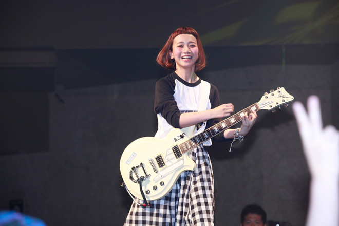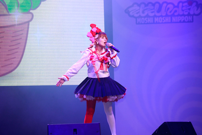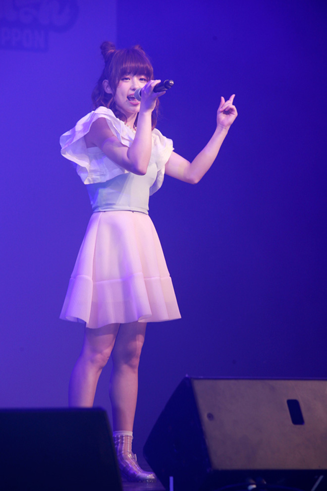 そして、ステージに名前が映されると同時に、はち切れんばかりの声援が巻き起こったのは三戸なつめ。デビューシングル「前髪切りすぎた」のカップリングソング「コロニー」でスタート。また、三戸なつめのお菓子ランキングNo.1“キャベツ太郎”の応援歌「キャベツのやつの歌」の歌唱中に、“キャベツ太郎”を観客席へ投げ入れるパフォーマンスで会場をさらに沸かせた。MCでは台湾のファンと「前髪短いやん!」などと会話を楽しんだ後、ラストの曲へ。会場から「え〜!」と惜しむ声が上がると、「めっちゃ謝謝!」と関西弁を交えて感謝の気持ちを伝えていた。ラストはもちろん台湾盤も発売された「前髪切りすぎた」。台湾のファンも「チョキチョキ」とコールし、最後まで大盛り上がりのステージとなった。