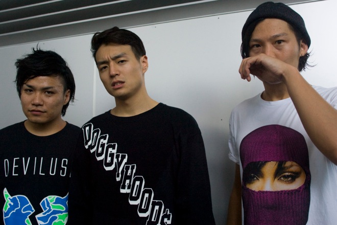 EVIL STAGEを熱く盛り上げたのは、数々の海外のハードコア、メタルコア・バンドとも共演し、タフなプレイを聴かせるCRYSTAL LAKE。屈強でメタリックなサウンドでキッズを揺らし、大きなシンガロングを巻き起こしたステージ直後の、汗だくの3人をキャッチ。