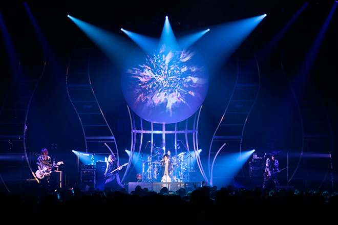 暗転するとメンバーが一人ずつ登場。アルバムのリードトラック「Quints」から早くも会場のテンションは急上昇、YOMI(Vo)が「魂は一つだろ?今日はラストまで盛り上がっていこうぜ!」と呼びかけると大歓声がそれに応えた。「恍惚」ではYOMIが柩(G)にチュッとキスをするおちゃめなパフォーマンスのあと思わずステージから足を踏み外し、照れ笑いを浮かべるシーンも。そんなライブならではのハプニングに会場も沸いた。「Cherish」「Demand」とアップテンポなナンバーではしゃいだり、「fade」では切ないメロディと歌詞に聞き入るファン。また今回は15周年ということもあり、日本テレビ系アニメ「デスノート」の主題歌にもなった「アルミナ」と「the WORLD」が久し振りに披露された。新曲とはまた違った馴染み深い曲に、嬉しそうな表情を浮かべるファンも見られた。