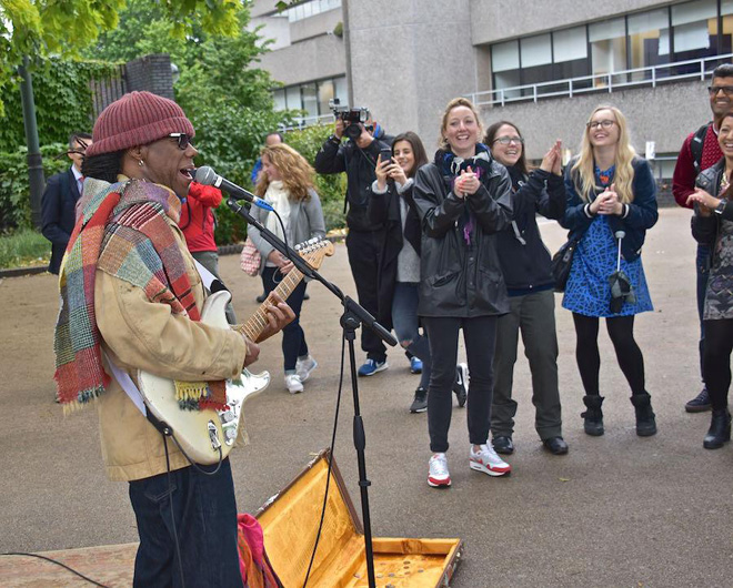 最初は誰も彼だと気付かなかったようだ。ロジャースはTwitterにその写真を公開し、「今日、ロンドン、サウスバンクの道端でプレイした。ダンス・ミュージックをプレイするまで人だかりはできなかった。うーん?」とつぶやいた。