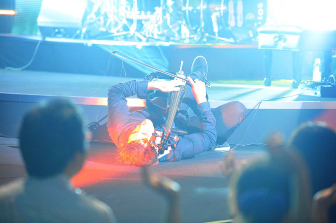 これまでにも肩からチェロを提げて固定する「チェロ・キャリアー」でステージを走り回るなど奇想天外な発想で楽しませてくれたステファンは、今年も床の上にあおむけ状態で回りながら演奏する驚異の「フロア・パフォーマンス」をAC/DC「サンダーストラック」で披露。いまやあらゆるポジションでも難易度マックスの演奏ができるようになったのだ。