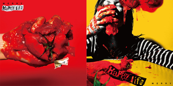同時に解禁された「Happy life」のジャケットは、潰された真っ赤なトマトがインパクト大! このトマトは、これから制作されるミュージックビデオでも登場する予定とのことで、MERRYの奇想天外なアイデアは尽きないようだ。