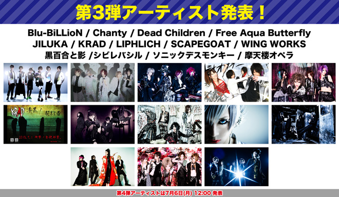 出演アーティスト(6月29日現在):ALDEBARAN / Blu-BiLLioN / Chanty / CLOWD / Dead Children / DEZERT / DIAURA / DIV / DOG inTheパラレルワールドオーケストラ / ENVIOUS / Far East Dizain / Free Aqua Butterfly / JILUKA / KRAD / LEZARD / LIPHLICH / LOUD GRAPE / MEJIBRAY / More / NOCTURNAL BLOODLUST / RUVISH / SAKURA / SCAPEGOAT / Shellmy / THE BEETHOVEN / the Raid. / WING WORKS / yazzmad / アンフィル / えんそく / 黒百合と影 / ゴシップ / シビレバシル / 少年記 / ソニックデスモンキー / 弾丸 NO LIMIT / ペンタゴン / 摩天楼オペラ …and more