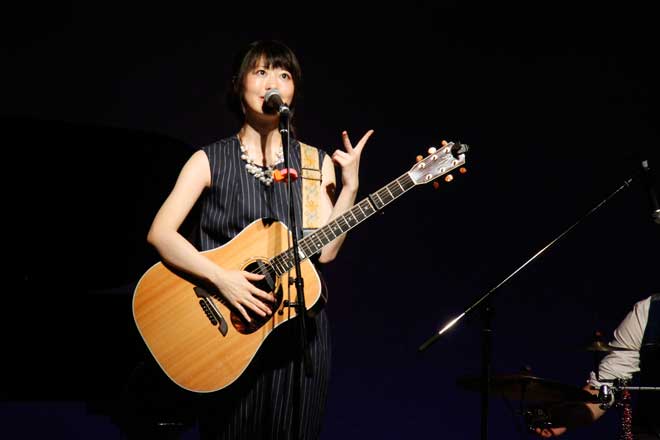 イベントのトリとして、ももちひろこの登場だ。普段はアコースティックギターでの弾き語りを行なっている彼女だが、この日はピアノとパーカッションにサポートメンバーを迎えて、1曲目「瞳のシャッター」を披露。「今日は心強いサポートがいますので、2人に任せて1曲ハンドマイクで歌いたいと思います。」とギターを置き「もしもの話」を歌い、観客は手拍子で盛り上げた。