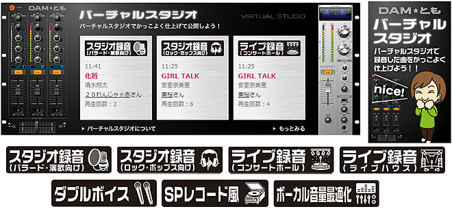 自分の歌った曲をよりかっこよく仕上げてみんなに聴かせられる! 通信カラオケシステムDAMの最高位機種「LIVE DAM STADIUM」で録音した歌唱データをカンタンな操作でクオリティアップできる新サービス「DAM★とも録音 バーチャルスタジオ」が7月1日よりスタートした。