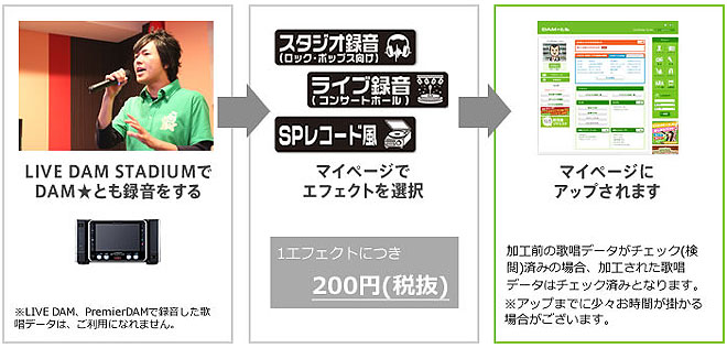 DAM★とも録音した曲に加えるエフェクトは、DAM★とものマイページで選択、その後加工済みのデータがマイページにアップされる。料金は1エフェクトにつき200円(税別)。対応機種は最新モデルのLIVE DAM STADIUMのみ。LIVE DAM、PremierDAMで録音した歌唱データでは利用できないので、カラオケ店で機種選択時にしっかりチェックしておこう。