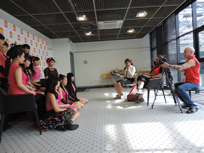 「取材の途中、通訳さんの不思議な日本語が多用され笑いをこらえるので必至でした。『嫉妬するアイドルは誰?嫉妬するアイドルは?』って。おそらく『ライバルのアイドルはいますか』と聞きたかったのでしょう。こう言ってやりました。ライバルはいません、そして他のアイドルさんに負けませんし、オレンジポートは無敵No.1でいます」と。」──ダンス得意担当・小池珠璃(14)