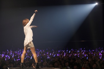 この流れにオーディエンスのテンションはさらに上昇。手拍子とともに大合唱が巻き起こる。そんなファンとステージの心をつなげるかのように、ここでは舞台照明とフロアが同じブルーのエイルカラーに染まった。「サテライト」は笑顔を呼ぶポップチューン。楽しそうに手を左右に振るオーディエンスに向けて、“どんな時も側にいるから”と歌うこの曲では柔らかな声色を混ぜたボーカルで観客の心にタッチしていった。
