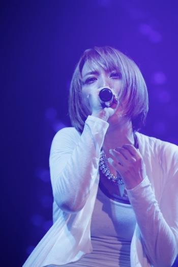 「一緒に手を振ってくれてありがとう。ここで質問! 今日初めて藍井エイルを見たという人!?(フロアの約半数が挙手)。おぉ~。初めまして藍井エイルです。今回のツアーは激しい曲もあったりします。気分が悪そうな人を見つけたら、すぐにスタッフに声をかけてあげて下さいね」