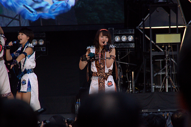 ここで意外としっとりしたミドルチューンもいけるアプガが繰り出してきたのは、「End Of The Season」。アプガファミリーも落ち着いたクラップとともに彼女たちの歌に聴き入る。続く「夕立ち!スルー・ザ・レインボー」で再びテンポのよい爽やかなパフォーマンスを披露する頃には、いよいよ日暮れ時に。
