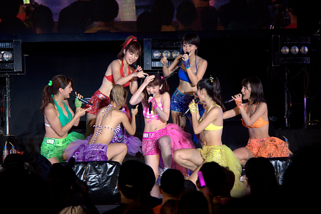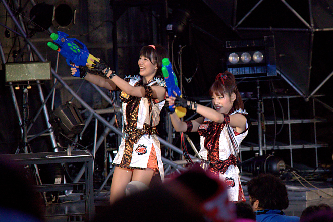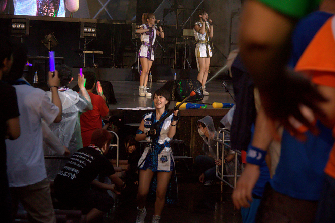 さらに新衣装から「みーんな脱いじゃお!」ということで上半身ビキニ姿になったアプガは、ラスト曲で「サマービーム!」を披露。野音会場に大量のバブルシャワーが噴き出す中、水鉄砲を手に観客席通路を練り歩き、アプガファミリーと大はしゃぎするアプガメンバーだった。