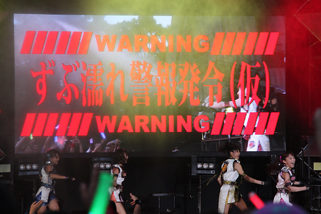 後半戦の出だしをきったのは、新曲「アッパーレー」。この日比谷野音公演で初披露となった同曲では、スクリーンに「ずぶ濡れ警報発令(仮)」の文字が。ハイテンポなリズムにのってメンバーが撃ちはじめる水鉄砲もかわいいものに混じって消火ホース並みの飛距離抜群な大型のものが登場し、アプガメンバーもアプガファミリーもずぶ濡れになりながらテンションを跳ね上げる。