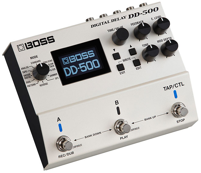 「DD-500」は、「BOSSが考える次世代ディレイ・ペダルの新しいカタチ」と銘打ったディレイ・ペダル。シャープで精悍なボディに、先進のスペックと数々のアグレッシブな機能を凝縮。入力から出力まで最高水準32ビット処理による高音質の実現が最大の特徴。艶やかなサウンド、12ディレイ・モードによる音作りの深さと自由度、大型LCDや専用つまみによる使い勝手の良さも、次世代ディレイ・ペダルと呼ぶに相応しい仕上がり。さまざまな操作が行える3フット・スイッチを装備。MIDI入出力端子の装備で、外部機器からのパッチの切り替えやパラメーターのコントロールも可能。さらにUSB端子によるPC接続もサポート、フレーズ・ループ機能も搭載する。