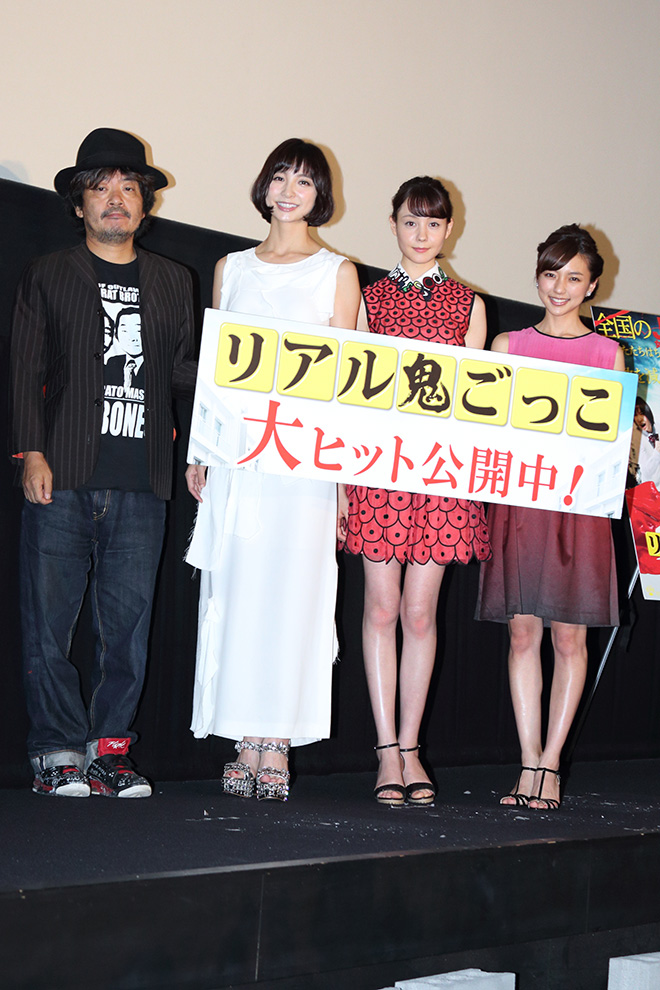 7月11日、トリンドル玲奈、篠田麻里子、真野恵里菜のトリプルヒロインによる映画『リアル鬼ごっこ』が公開初日を迎え、3人のヒロインとメガホンをとった園子温 監督が舞台挨拶を行なった。さらに、3人のヒロインは『リアル鬼ごっこ』の大ヒットを願って“鬼”瓦割りに挑戦。見事8枚の瓦を叩き割った。