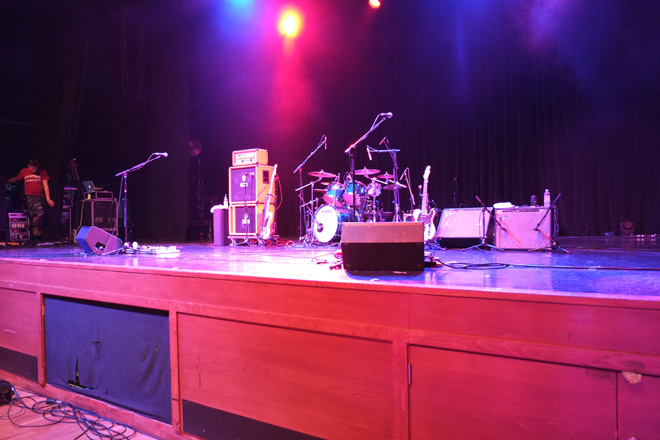 フロアは最後のチェックととともに、静かにSEが流れ始めた。楽器群がステージで静かにその時を待っている。会場入口にはCDやアーティストTシャツなどオフィシャルグッズも用意され、直販される。初日はVAMPSのTシャツが異様な売れ行きを示していた。あと10分で会場にオーディエンスが流れ込んでくる。
