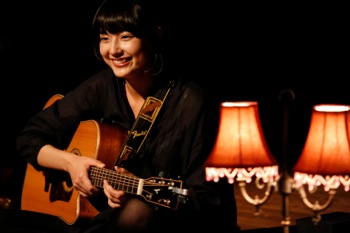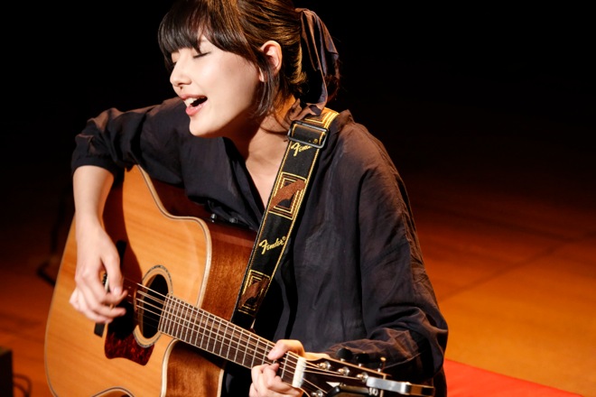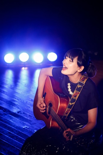 「おじゃまします」とささやいて、特別席の真ん前、舞台の床にそのまま座る。あぐらをかいてギターを抱える。まるでリビングルームにいるように。ほんのりと蒸気した頬。生々しいくらいの距離感にドキリとする。やさしく「あたたかな時間」が歌われる。よく“歌の世界観に引き込む”という表現が使われるが、ここで目にしたものは、その逆。会場外の喧噪をも含むあらゆる生音、舞台装置、照明効果が一体となり、歌の世界が劇的にフロアへと溢れ出しているのだ。“歌を聴く”のではなく、“歌の中いる”感覚とでもいえばいいか。フィクションと現実との境目を壊すように、劇的な空間が広がりつづける。この夜、沖ちづるは「ようこそ」とばかりに、とてもおだやかな雰囲気をまとっていたが、自分の居場所に友人を招いたような気持ちだったのだろう。