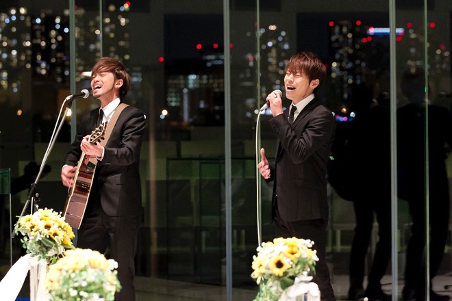 チャペル内で待つ男性のもとに、何も知らされずに誘導されて来た女性が到着すると、緊張のプロポーズがスタート。見事成立し、指輪を渡された直後に、そのシーンを息を潜めて見届けていたHoney L Daysが、ドラマ『ホテルコンシェルジュ』を代表してサプライズで登場。テーマソング「デスペラード」(イーグルスの日本語詞カバー)を生歌唱した。