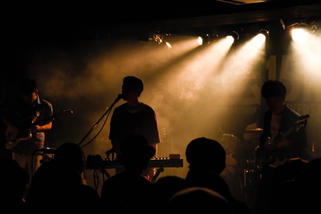 1曲目「Illumination」のシンセの音が鳴った瞬間に、会場を夢と現実の狭間のような甘美な場所へと誘ったのは、3番手のThe fin.だ。80-90年代のシンセポップ、シューゲイザーに影響を受けた楽曲が、日本のみならず海外からも大きな注目を集めている彼ら。楽曲は限られたコードのループだけで進行し、音数も必要最低限。なのにこれほどまでに叙情性を持った深淵な世界を描き出してしまうとは。そしてそんな幻想的な世界の中をふわふわと漂うUchinoの歌声も魅力的。シンプルな演奏だからこそ目立つ、彼の歌心に感服せざるをえなかった。ライブが進むに従って演奏の肉体感はどんどんと増し、それに呼応するかのようにリスナーの熱も高まっていく。