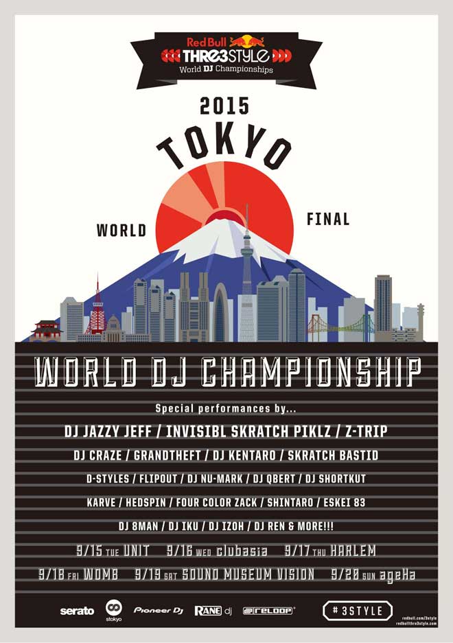 9月15日~20日に、世界No.1のDJを決める大会<Red Bull Thre3Style 2015>のワールドファイナルが日本(都内6ヶ所)で開催される。そのゲストアーティストが発表された。