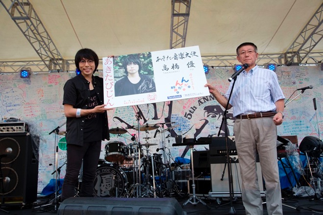 また今回のイベントでは、地元秋田の魅力を県外の方にも感じてもらいたいと、“ババヘラアイス”や“横手焼きそば”などの秋田名物フードコートが設置されたり、ステージでは12時から「なまはげ太鼓」など秋田伝統郷土芸能ステージが展開された他、高橋の母校「山内中学校」の生徒による合唱も披露された。そして、オープニングセレモニーで「あきた音楽大使」第一号に任命されたことが発表され、本日の主役・高橋優が登場すると、詰めかけた約5,000人のファンから大歓声が。佐竹敬久秋田県知事より、「テレビなどでごく自然に秋田をPRしてくれて、今、一番秋田を元気にしてくれる男!秋田を音楽で全国、全世界に広めて欲しい。秋田県民全員、優くんファンになりましょう!」と、熱い応援メッセージが贈られた。高橋は「僕のライブでもずっと立って踊っているような熱い県知事と一緒に、秋田の音楽を盛り上げていきます!」と意気込みを語った。