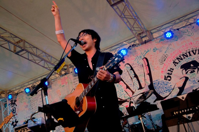 そしてステージの背景には、会場で事前にファンが書き込んだ巨大な寄せ書きフラッグが掲げられ、降り続いた雨がぴたりと上がった16時過ぎ、本日のメインイベント「高橋優フリーライブ」が大歓声の中でスタート。いきなりデビュー曲の「素晴らしき日常」のイントロでは“いくぞ秋田!”と雄叫びをあげ、「太陽の花」では“俺らが秋田の太陽になろうぜ!”と続けた高橋優。そして、バンドで初のパフォーマンスとなる昼ドラ主題歌「おかえり」を披露し、「ここから盛り上がるぞ秋田!」の掛け声と共に「パイオニア」、最新シングル「明日はきっといい日になる」などで畳み掛けた。さらに、秋田弁を満載に取り入れた「泣ぐ子はいねが」では、本場のなまはげがステージに乱入。和太鼓を打ち鳴らし、地元秋田で初のなまはげ共演に会場はさらにヒートアップしていく。