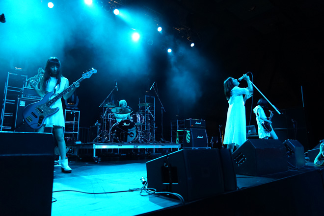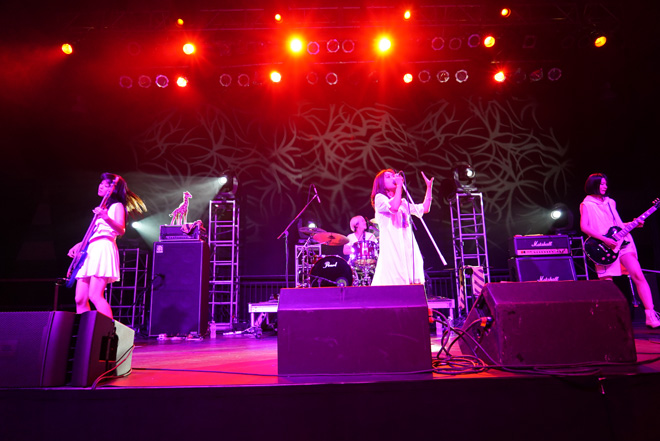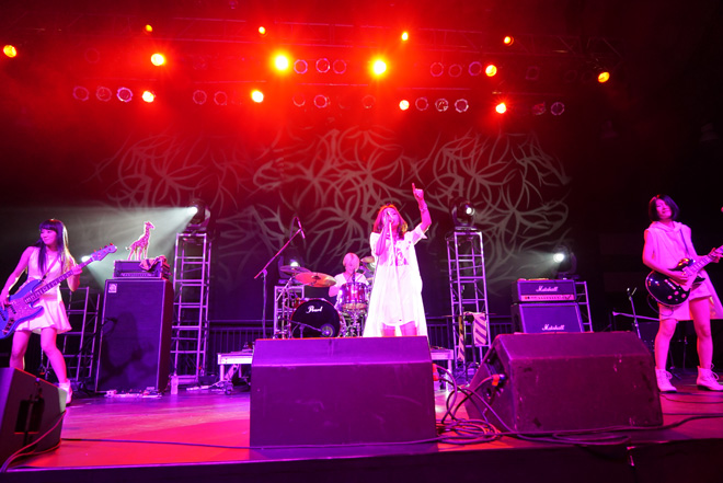 この日のステージは、オリジナルソングからアニメカバー曲を織り交ぜたセットリストが組まれており、いきなりL’Arc~en~Ciel「READY STEADY GO」からスタートするという攻めのセットリストでオーディエンスに先制攻撃を繰り出す。ご存知のとおり「鋼の錬金術師」のオープニングテーマ曲にもなったこの楽曲で、会場はいきなりヒートアップし、SIAM SHADE「1/3の純情な感情」をも披露、その後新曲「This is me.」、ライブの定番曲「アブラカタブラ」で完全にオーディエンスを惹きつけ、多くの観客がタオルを振り回し、約70分のステージで2000人の観客が総立ちとなった。