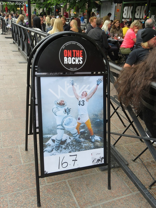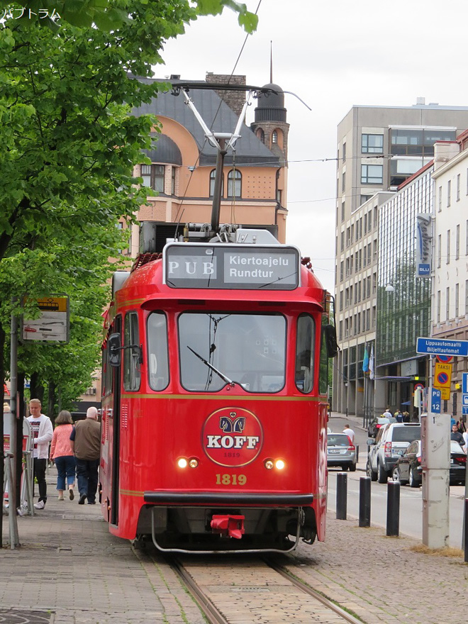 このバーは地下にライブハウスがあり、この日はWÖYH!というバンドのライブがありました。このバンドはフィンランドでとっても人気のメタルバンドStam1naのヴォーカル&ギタリストAnttiがお兄さんJussiとやってる歌詞がフィンランド語のユニークなプログレッシヴバンド。彼らのデビューアルバム『Ikkillyk』は日本盤発売予定がないながらにも歌詞が全部日本語に訳され、彼らのLPレコードには和訳がついています。このバンドについてはまた機会があれば紹介したいと思います。テラスにもメンバーがでてきていて、ライブに誘われたのでありますが開始が21時から。21時スタートというのはフィンランドにしては早いスタートなのでありますが、この6月に利用しているバスの時刻表が変更になり夜の時間帯のバスがなくなってしまい、最終のバスが21時ヘルシンキ発(泣)。電車の通ってない町にすんでるのでそのバスだけが便りだったというのに。確かに夜遅くとか深夜の時間帯は乗客は少なかったのでなくなったのもわかるものの困った状況であります。というわけでせっかくながらもWÖYH!のライブはあきらめ、Private Lineのライブもまだ続いてましたが、最終のバスを逃したら次は朝の7時なので会場をあとにしました。ふとみたら近くに夏の間だけ運営されてるトラムのパブが停まってました。このOn The Rocksの横の停留所から乗れるようです。6月の夏至祭を過ぎ、日は確実に短くなってきてますが、21時はまだまだ明るいフィンランドの7月です。
