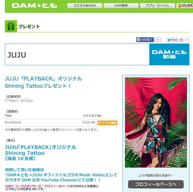29枚目のシングル「PLAYBACK」がこの夏を熱く盛り上げているJUJUが「DAM★とも」とコラボ、動画の投稿でオリジナルShining Tattooが当たるプレゼント企画がスタートした。