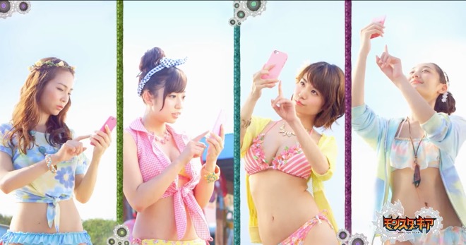 また、モンギアのプロモーションを行なうグラビアアイドルユニット・モンギアガールズの水着姿が見どころのWEB限定PVも公開となっている。こちらは男子4人のCMとは異なり、キュートな4人が砂浜で飛んで跳ねて揺れてモンギアを夢中で楽しんでいる映像だ。