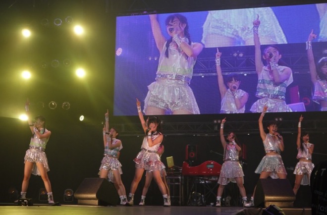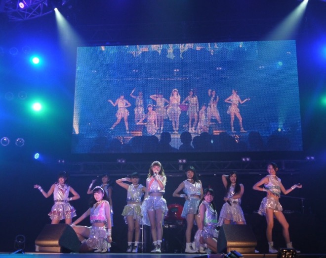 Doll☆Elementsの盛り上がりを引き継いで迎えられたのは、SUPER☆GiRLSだ。宮崎理奈を先頭に「ここからはSUPER☆GiRLの時間でーす!」と勢いよく飛び出した彼女たちは、夏のテッパンソング「MAX!乙女心」で一気に会場のボルテージを上げていく。さらに「イッチャって♪」コール、「ヤッチャって♪」コールとともに、新曲「イッチャって♪ ヤッチャって♪」に「ギラギラRevolution」と、灼熱の太陽よりも熱い夏ソングをぶつけて、<IDOL NATION>は、いよいよ白熱のアイドル祭りの状態へと突入していく。