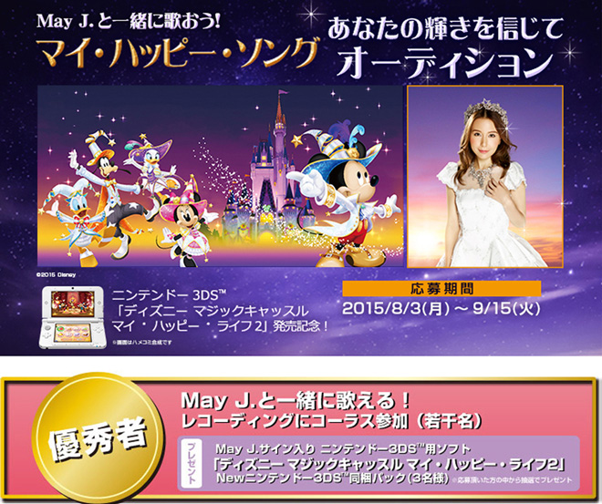 そして、ゲームでも流れるテーマソングを唱うのは、May J.。今回のオーディションで優秀者(若干名)に選ばれるとなんと、May J.のレコーディングにコーラスとして参加できるのだ。また、応募者の中から抽選で3名様にMay J.サイン入りニンテンドー3DS用ソフト「ディズニー マジックキャッスル マイ・ハッピー・ライフ2」Newニンテンドー3DS同梱パックが当たる。