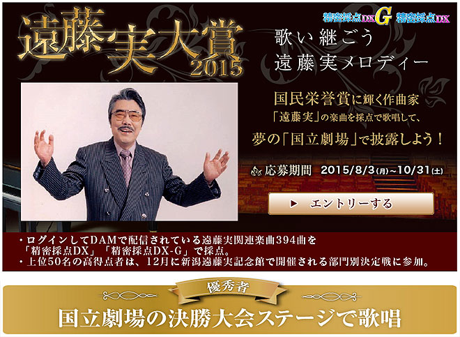「遠藤実大賞2015」はDAM★ともサイトでエントリーのうえカラオケ店でデンモクにログイン、テレビでおなじみとなった「精密採点DX」または「精密採点DX-G」(最新カラオケ機種LIVE DAM STADIUM限定)で歌うことで応募する(歌唱後のエントリーも可)。課題曲は遠藤実関連楽曲500曲から自由に選択可能となっている。