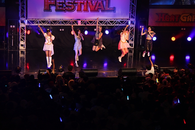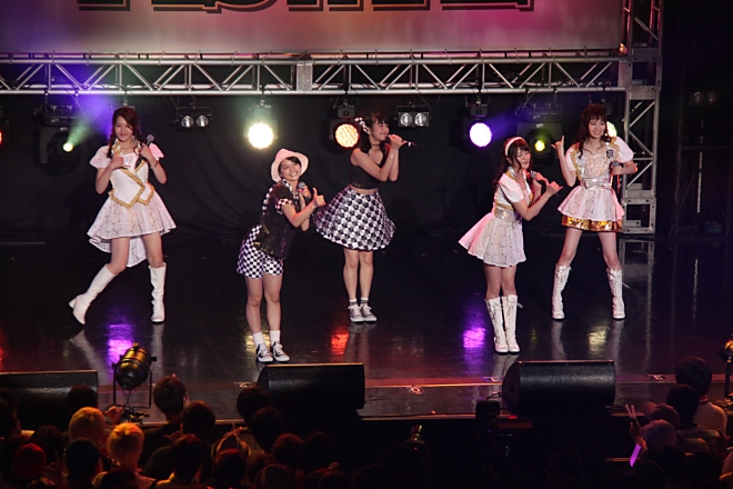 「私のソロをルリカさんが歌ってて、もう歌えないなと思いましたこの後」と高見奈央がMCでぶっちゃけつつ、続いてステージには大矢と高見、そしてアイドリング!!!5期生である高橋胡桃、石田佳蓮、玉川来夢の姿が。「それでは“幻の5期生”で可愛らしく盛り上げたいと思います」というMCが入ると会場からは一気に興奮した歓声が沸き上がった。5人はアイドリング!!!のガーリーなチューン「キュピ♥」をコラボ披露。今年の<TIF>にふさわしい、非常にレアなコラボとなった。
