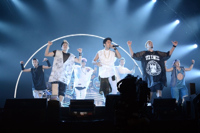 オープニング映像がスクリーンに写された後、今回の<OTO_MATSURI 2015>のプロデューサーであるEXILE HIRO、DJ MAKIDAI、VERBAL、DJ DARUMA、からなる新ユニット・PKCZ(R)のDJ陣二名とVERBALがステージに登場。絶妙な掛け合いのDJプレイと煽りで、会場をこれでもかという程に沸かせていく。期待感が最高潮になり会場全体で自然と手拍子が鳴り響いていく中、「まずはコイツら!」と名前を呼ばれ大歓声があがったのはGENERATIONS from EXILE TRIBE。アゲアゲなダンスチューン「REVOLVER」が会場を重低音で包み込んだ後、パフォーマンスメンバーのソロダンスに、8月12日にリリースされる新曲「Hard Knock Days」、伸びやかな美声が耳に心地良い爽やかダンスチューン「Sing it Loud」と、あっという間に会場を引っ張っていった。