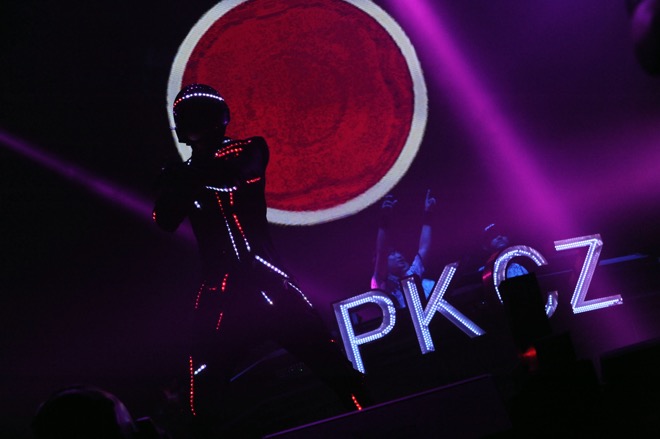 続いてEDMの名曲「BOOYAH」、EXILEの楽曲など誰もが踊れる曲をDJ MAKIDAI、DJ DARUMAが繋いでいく。そんな中、ダンスパフォーマンスを繰り広げたのはSAMURIZE from EXILE TRIBE。なんとココまで、MCを除き音楽はノンストップ! PKCZ(R)がDJとして曲と曲を繋ぎ、アーティスト紹介までもこなす。音楽が途絶えることは無いのだ。これぞPKCZ(R)ならではのパーティ・スタイル! 「同じ時代のクラブシーンを生きてきた4人」が、「DJ、クラブを通して培われた感覚MIX」を実現するために結成されたユニットなだけある。音楽のジャンル、歌にダンスと関係無しに次々とステージ上でミックスされる。更には映像と光も融合し、観客たちをどんどん非日常世界へ引き込んでいった。