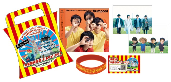 この“おみやげBOX”は全国から野外ライブに集まったファンに向けてリリースされるもの。スペシャルパッケージには、「夏よ止めないで ~You’re Romantic~」通常盤CDに加え、「真夏の野外★LIVE 2015「FOR ROOTS」オリジナルラバーバンド」や、メンバーの幼少期と現在を同時に楽しめる「オリジナルポストカード”ちびっこVer”と“おとなver”の2枚セット」、さらに彼らの地元松原市の協力を得て作られた松原市の該当店舗で使用できる「松原市お楽しみクーポン」を封入。文字通り“おみやげ”としても活用できる限定パッケージとなっている。