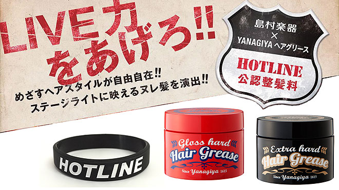 「HOTLINE」は、島村楽器が30年以上にわたってプロデュースを行なっている、音楽の新しい才能を発掘するための、ライブにこだわったアマチュアバンドコンテスト。同コンテンストの趣旨であるライブの「魅せる力」「惹きつける力」の一つとして、柳屋本店の発売する、固めずタイトなヘアスタイルを演出できる「YANAGIYAヘアグリース」が、コンテストの公式整髪料となった。あわせて「YANAGIYA ヘアグリースHOTLINE リストバンドセット」が島村楽器店舗(一部)で発売される。