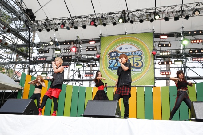MTV ZUSHI FES 15の2日目のオープニングアクトは、男女5人のメンバーで構成されるパフォーマンスグループ、lol。黒を基調にしたそれぞれの個性が光るスタイリングで登場し、「shake shake」で<ZUSHI FES>をキックオフした。