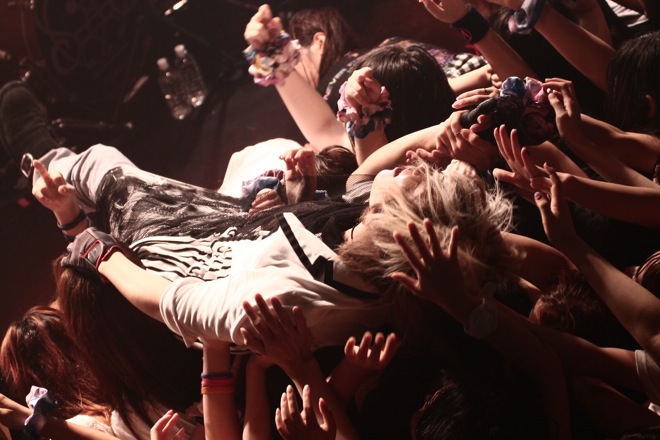 この日も猛暑の中、熱心なファンが詰めかけ、開演前からフロアの温度は既に上がっていた。ライヴはミニアルバム収録曲「La Vie en Rose」からスタート。明るく弾けるようなこの楽曲に続き、「LIVE or DIE」「理想」と激しい楽曲を叩きつける。二面性を巧みに使い分け、フロアの興奮を一気に頂点まで持っていく様子はキャリアに裏付けされた彼らの特異点の一つでもある。