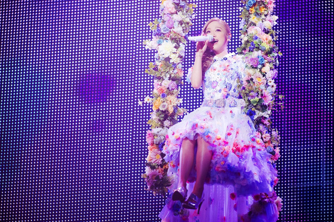 色とりどりの花が咲き誇る花園のようなドレスを身にまとった西野カナは、ブランコに乗ったまま「恋する気持ち」を歌唱、そのキュートで華やかなパフォーマンスから1転し、2曲目「We Don’t Stop」ではホワイトコーデにカラフルなビジューを散りばめたクールなコスチュームに速着替えをみせ、ステージバックとステージ床面に敷き詰められた大規模LED画面に映されるエレクトリックな映像と共にクールでアッパーなパフォーマンスを披露した。