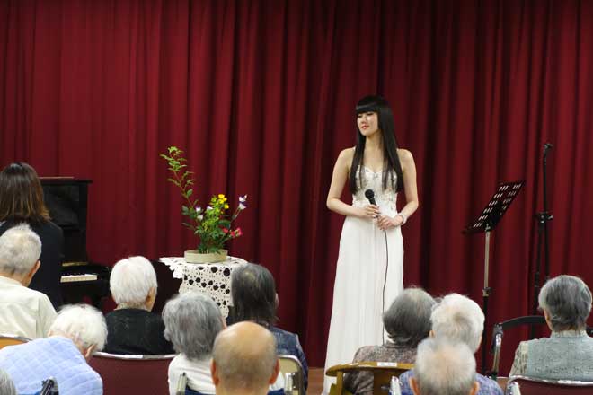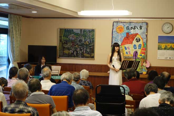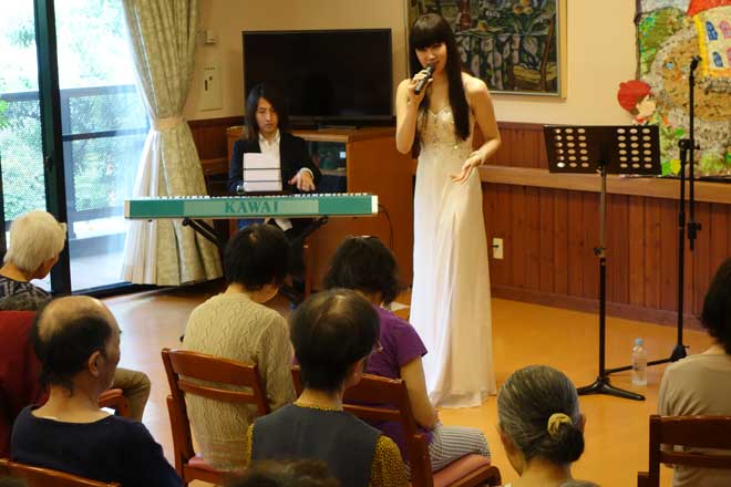 この日、<サマーコンサート シャンソンと懐かしの歌謡曲>と題したコンサートが両施設で行なわれ、入院患者のリクエストによる「見上げてごらん夜の星を」「上を向いて歩こう」「川の流れのように」など、シャンソンやオリジナル曲などを披露。浜崎容子は、おおくぼけいの伴奏で入院患約80人、辛夷園利用者約50人の前で歌い上げた。