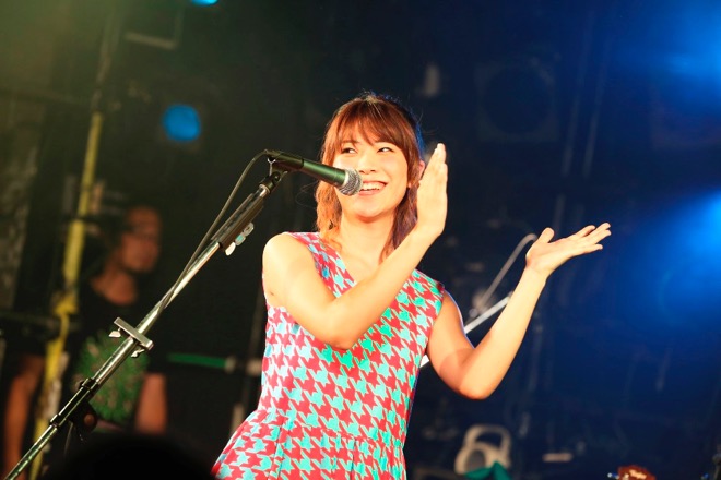 MVの公開が終わると、アルバムジャケットと同じワンピースに着替えた山崎あおいがステージに再登場。客席からも「可愛い!」と、歓声が上がる。そして後半は、「ほめられたくないワンピース」「ピンヒールベイビー」「shibuya cynic」「ツマサキ」と、新曲を次々に披露していく。色温度低めのライトに照らされて金色に輝く髪に、ワンピースで、愛器のテイラー214ceを抱いた姿。彼女が憧れる“彼女”と重ねてしまいそうな光景をも作り出しながら、ライブは、定番ナンバーの「レイコさん」で、この日一番の盛り上がりを迎えた。