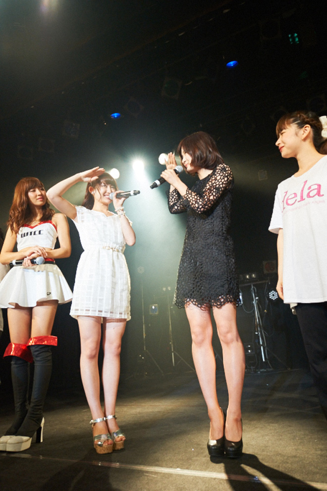 delaの公演で見逃せないのがワンマン限定ユニットだが、この日も2部は架乃愛美扮するDJ AIMIのDJパフォーマンスに乗せそれぞれが2人~3人のスペシャルユニットで登場、観客の大きな拍手が沸き起こった後は、dela初代キャプテン犬塚志乃による「SHANDY」のソロバージョンが熱唱され、古くからのdelaファンは大歓声を上げてレジェンドを出迎えた。