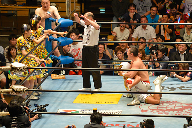 するとココ夏三郎を応援するためについにエビ中の3人もエプロンサイドに登り応援、関節技に苦しむココ夏三郎を鼓舞するなど、会場全体で「ココ夏三郎!」コールが巻き起こる程の盛り上がりになった。