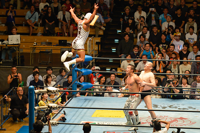 そして試合終盤には、渕選手の活躍もあり、試合は再び両者ゆずらぬ一進一退の攻防に。両チーム、迫力のある大技をくりだす中、ついに、リングサイドのポール上からココ夏三郎の必殺技「ココナッツペガサス」が金丸選手に炸裂。渕選手のバックドロップとの連携技から、カウントのチャンスがくるものの、惜しくも返されてしまう。